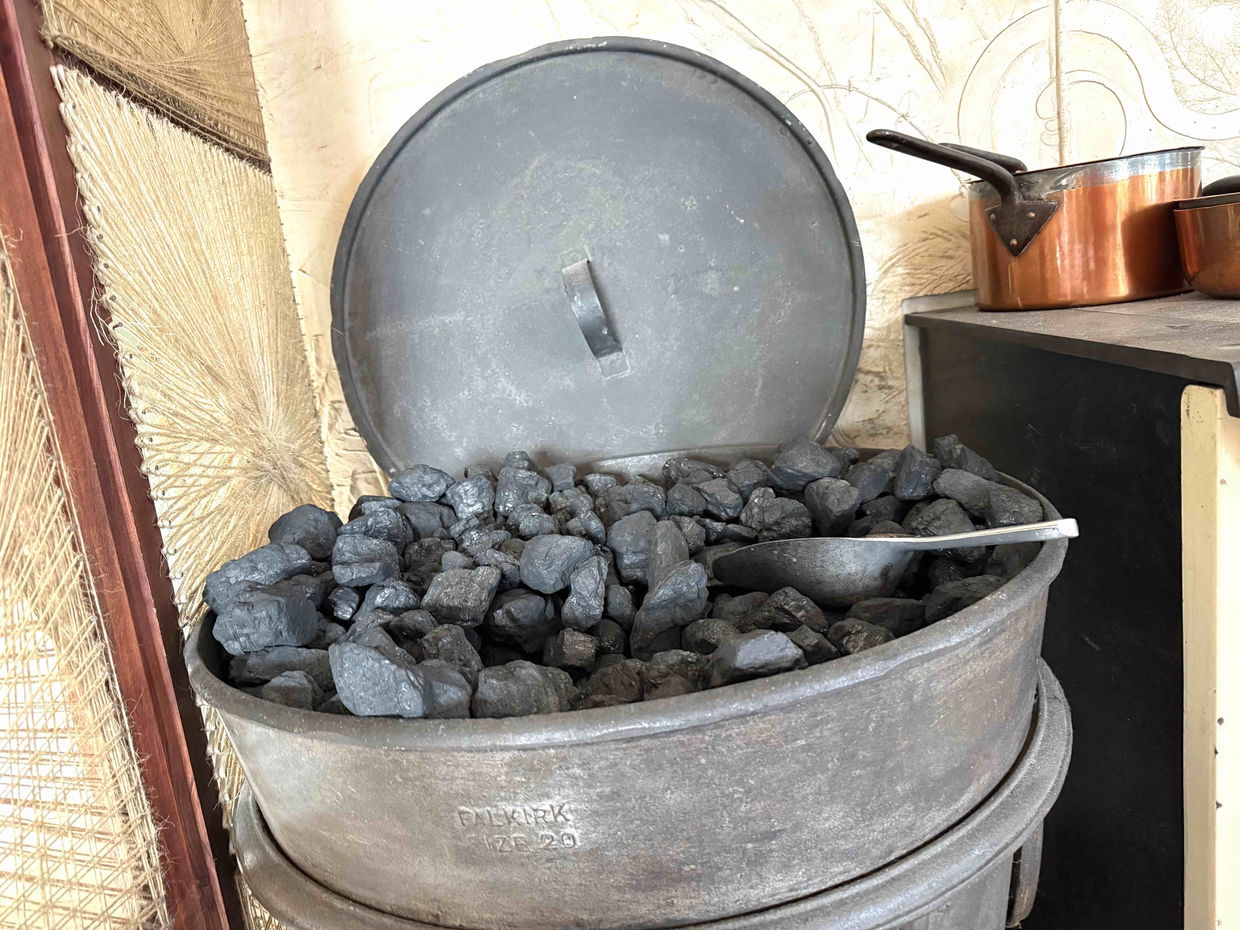 As our growing list of European road trippers all know the Aga is the invention of Swiss Nobel laureate Gustave Dalen. Invented as a gift to his wife while recovering from an accident that left him blind. The year? 1922.Our AGA is still fed in the original way. With Anthracite: Clean burning but dusty all the same and separated from all that white linen and elegant dining by a steadfast Falkirk No 1 that’s been transformed into a coal scuttle.
