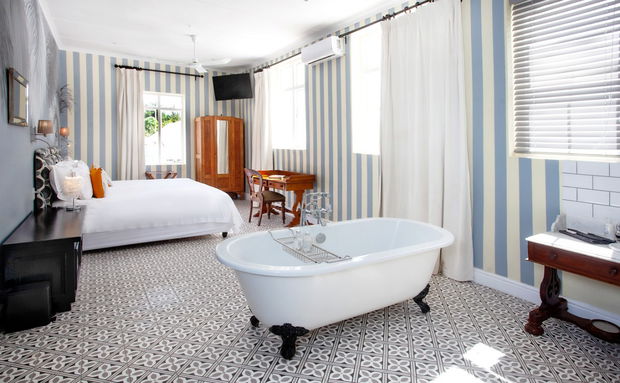 The brightest bedroom in the building is named after the bird that by myth hides its head in the sand to create the illusion of darkness . The stripe work in this room was beautifully executed by Barrydale artist and color expert Sean Daniel while murals were done by Barrydale mural artist Quinton Faro. Along with a shower this super large room also has a victorian ball and claw bath.